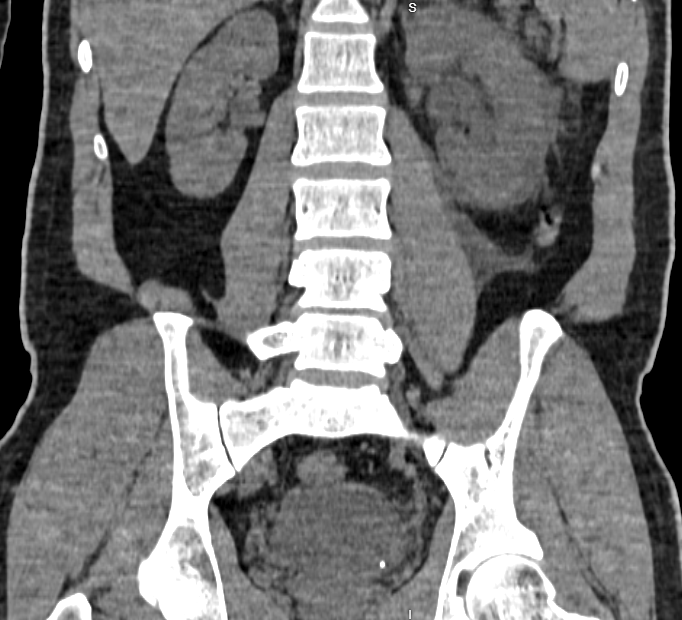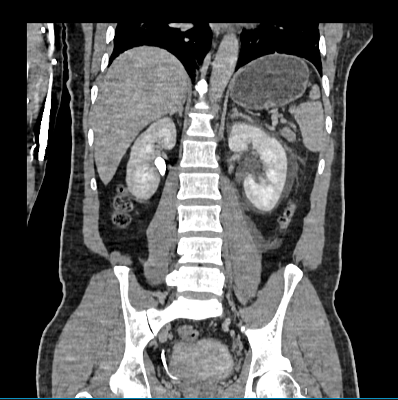 - Ureter: Left ureter is not opacified on the delayed scan.