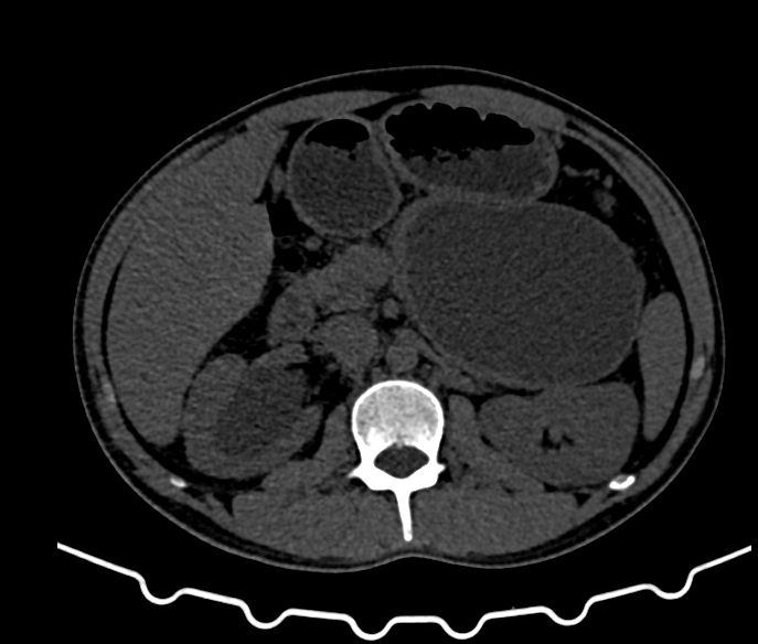 - Calculi: Multiple varying-sized calculi in the lower calyx; largest measures 15 x 9 mm (HU value 900-1050).